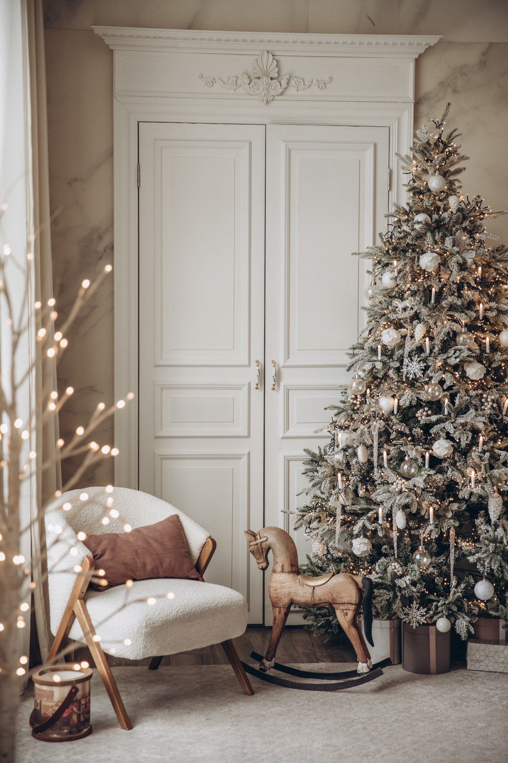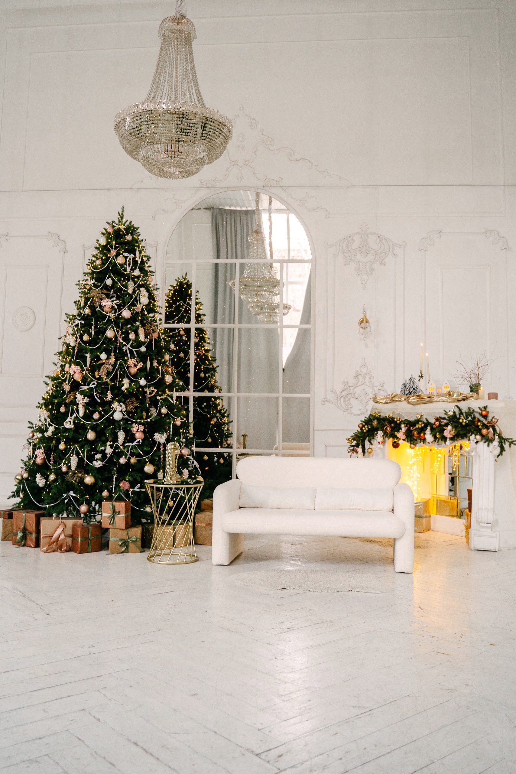 Зал Шале будет представлен в белых заснеженных оттенках. Камин, большая заснеженная елка, панорамные окна, большая библиотека, что может быть сказочнее в загородном доме.
